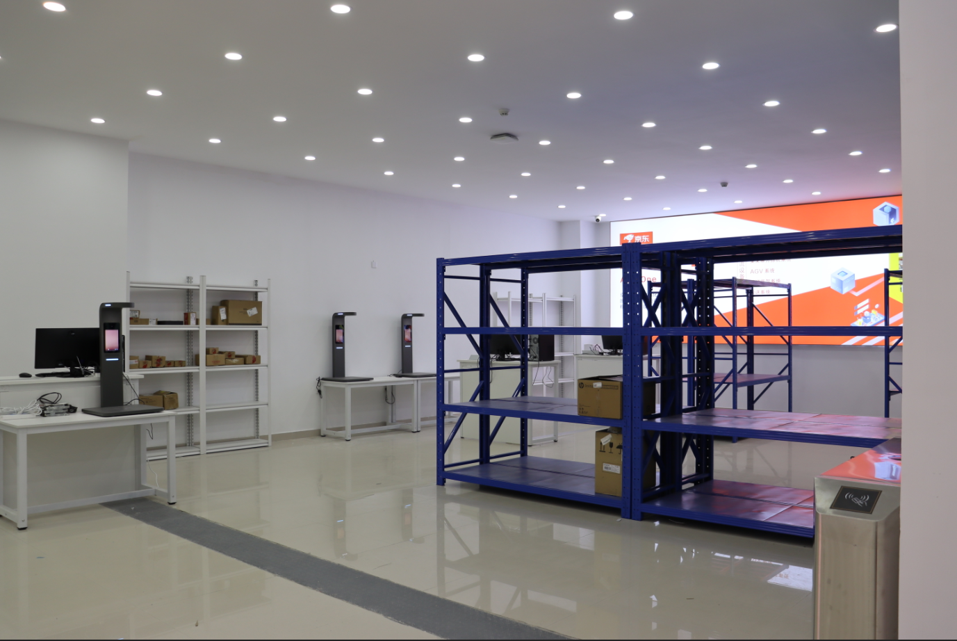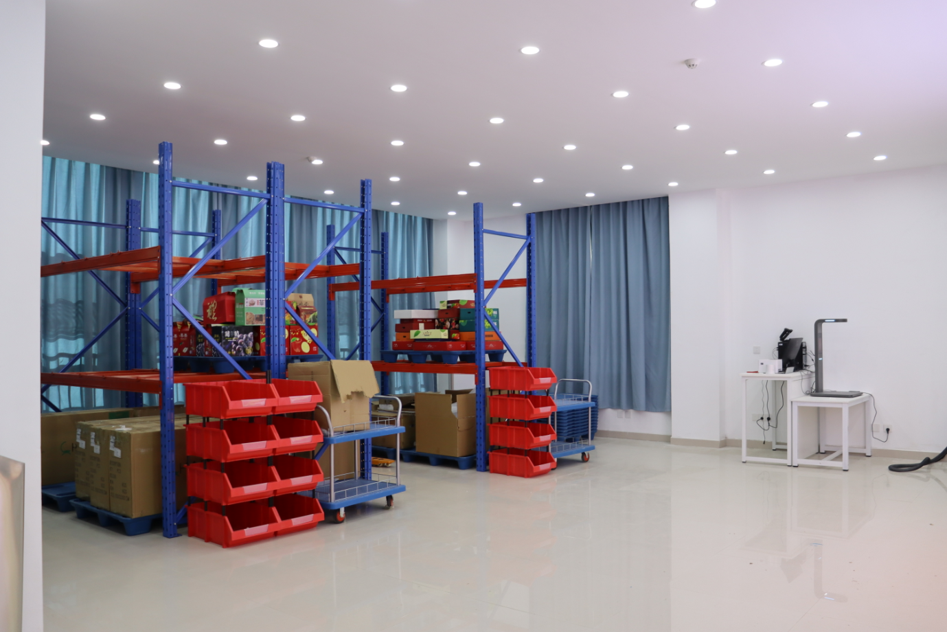 本中心具有仓储区主要放置大宗货物,仓储区的货物按照销量拆分放到分拣区货架上,通过分拣系统将客户下单的不同品类不同数量产品拣选出来打包,再由智能配送车或者人工的方式配送到客户手中。