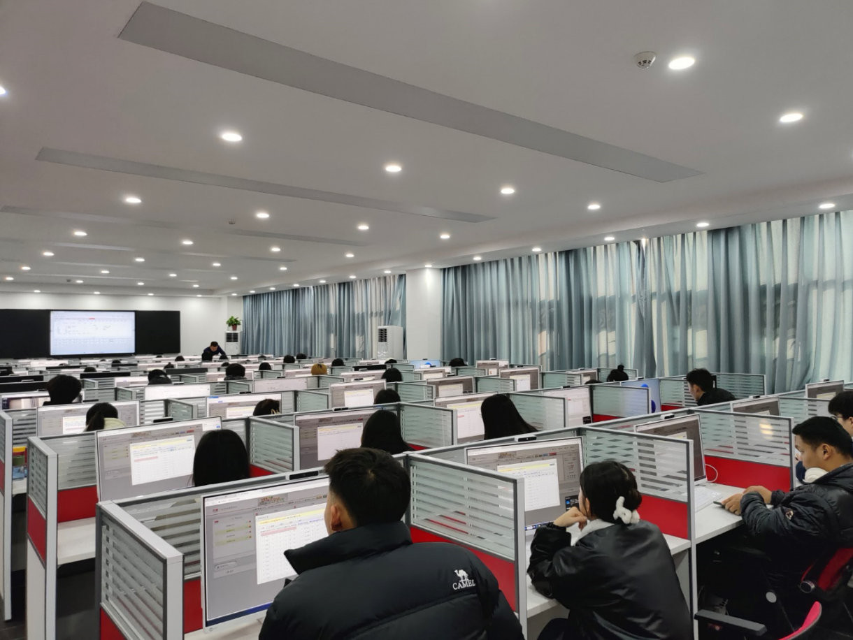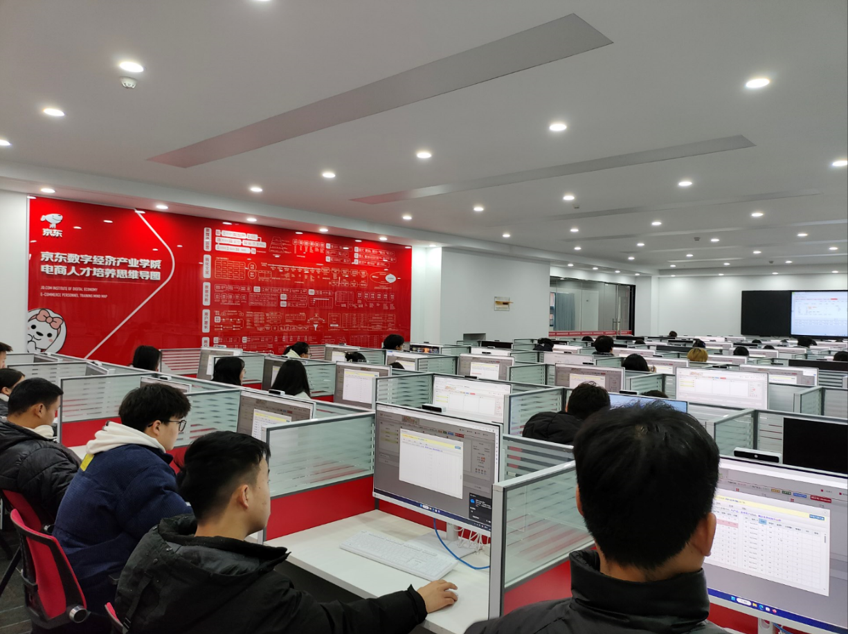 学生在这里通过电脑操作京东实战平台等实训软件,学习从店铺开设、商品发布、店铺装修、交易管理到售后服务、店铺推广的网点管理全流程操作。