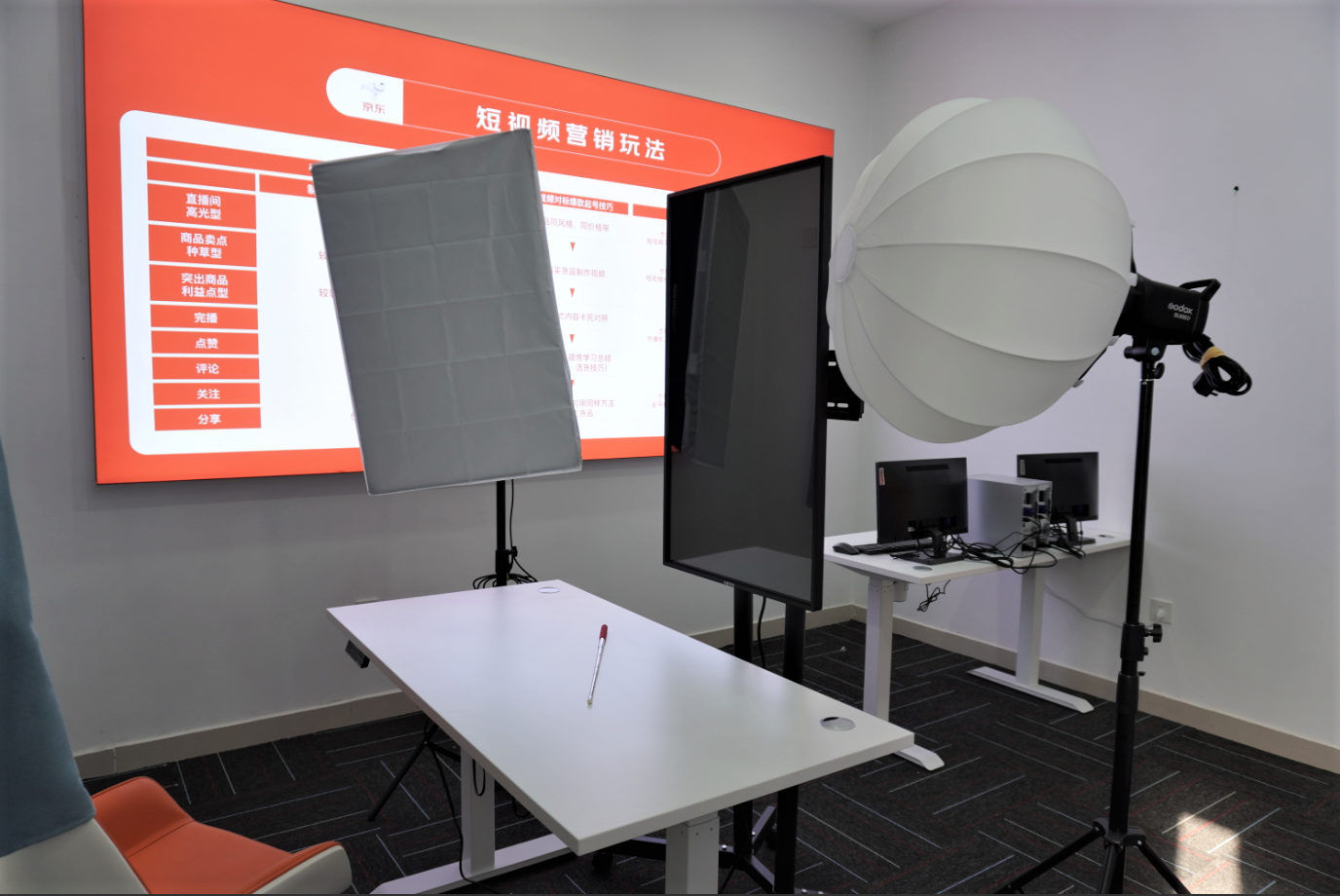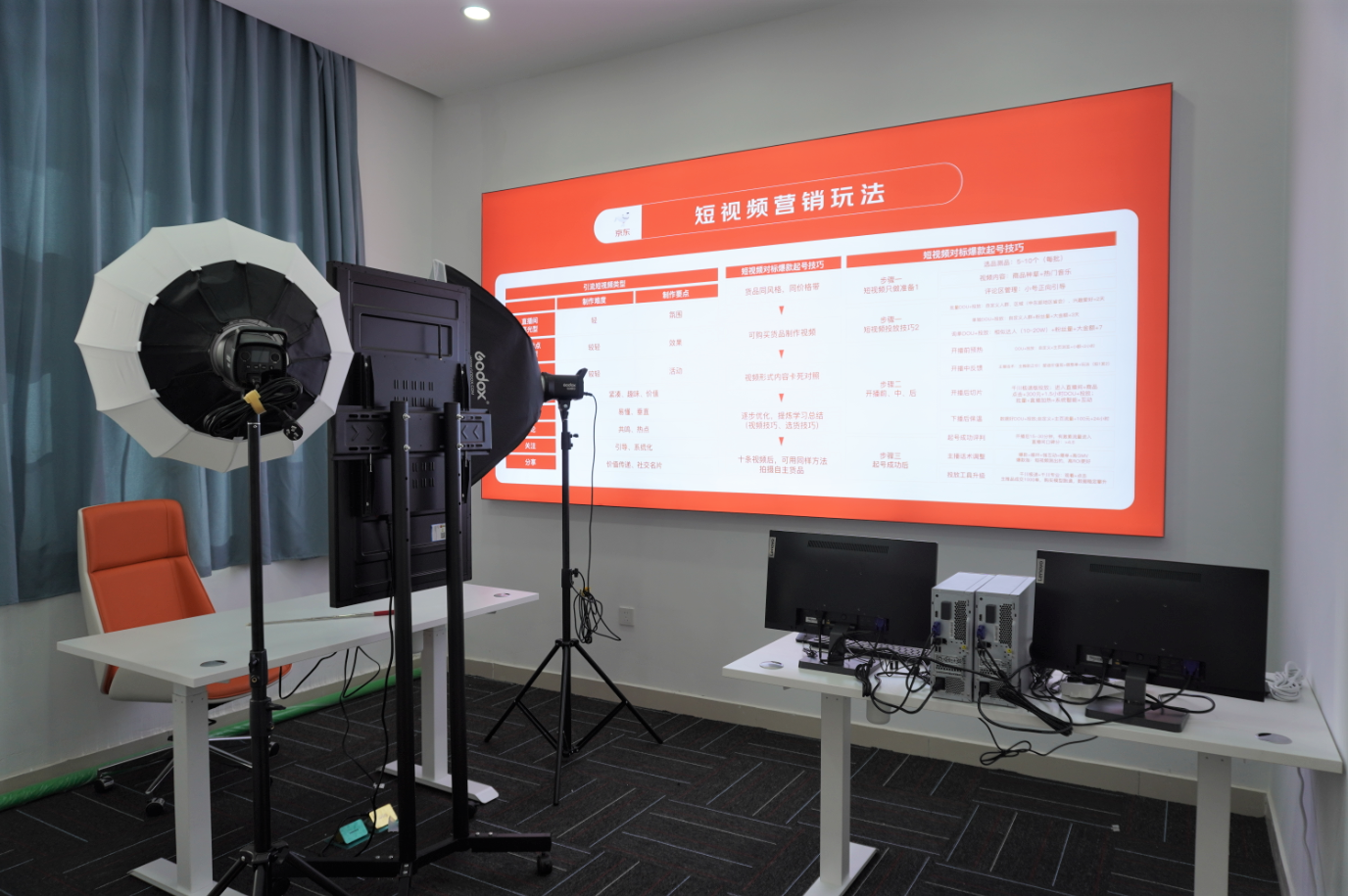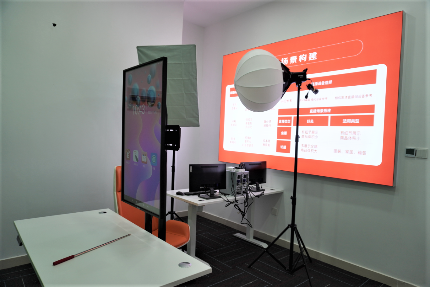 设置四间较小直播间,方便小件产品的带货直播。每个直播间内均配置高清两台电脑以及2K大屏。
